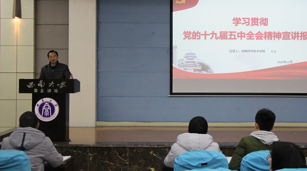 宣讲团成员精心备课,从党的十九届五中全会基本情况、党的十九届五中全会重大意义、《建议》 稿起草过程、主要考虑和基本框架、决胜全面建成小康社会取得的决定性成就、2035年远景目标等九个方面进行了宣讲。党的十九届五中全会是站在“两个一百年”奋斗目标的历史交汇点上召开的一次重要会议,为全面建设社会主义现代化国家把方向、定目标、绘蓝图、指路径,体现了高远务实的发展战略,凝聚了治国理政的中国智慧,为第二个百年奋斗新征程开好局、起好步提供了根本遵循。宣讲会在学生中引起了强烈的反响,同学们一致表示,要以党的十九届五中全会精神为指引,把个人理想追求融入到国家和民族的事业中,在实现伟大中国梦的生动实践中做出自己的贡献。