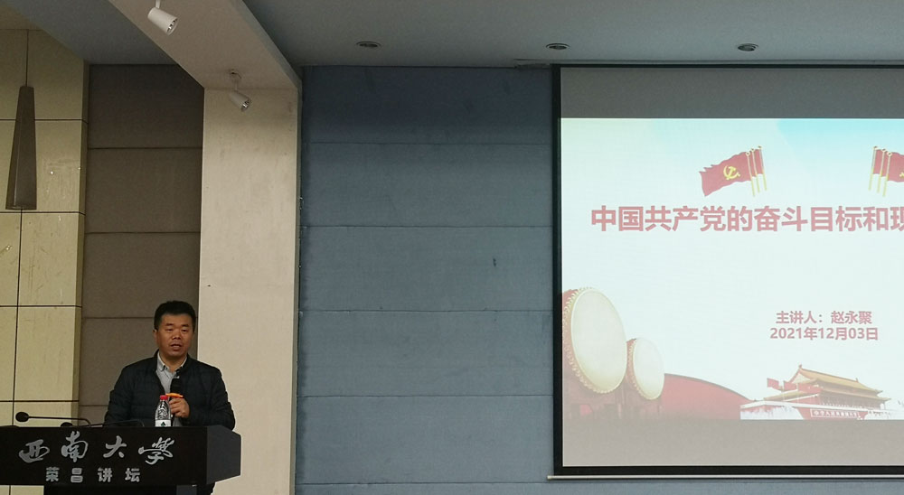12月3日,学院2021年秋季入党积极分子培训班进行第五次理论课学习。学院党委副书记、院长赵永聚为荣昌校区学员讲授了《中国共产党的奋斗目标和现阶段任务》,学院组织员贺春湘为北碚校区学员讲授了《学习贯彻习近平总书记“七一”重要讲话精神》。