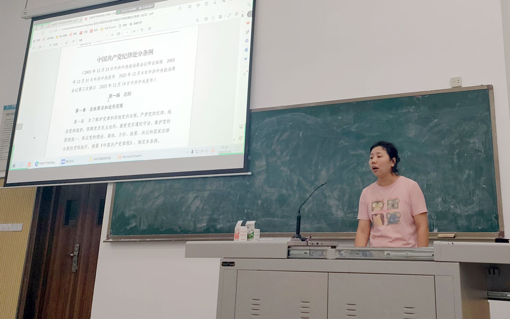 为深入开展党纪学习教育,提升学生党员的纪律观念和规矩意识,4月26日晚,学院本科生第四党支部在2511教室召开党纪学习教育动员部署会并进行第一次集中学习。支部全体党员参加,会议由党支部书记彭香主持。