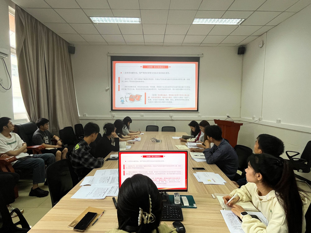 6月4日下午,学院研究生第二党支部书记范成莉在北碚校区37教118会议室为全体党员和入党积极分子讲“学《中国共产党纪律处分条例》、明规矩、严自律、树形象、在深学细悟笃行中争做新时代合格党员”专题党课。