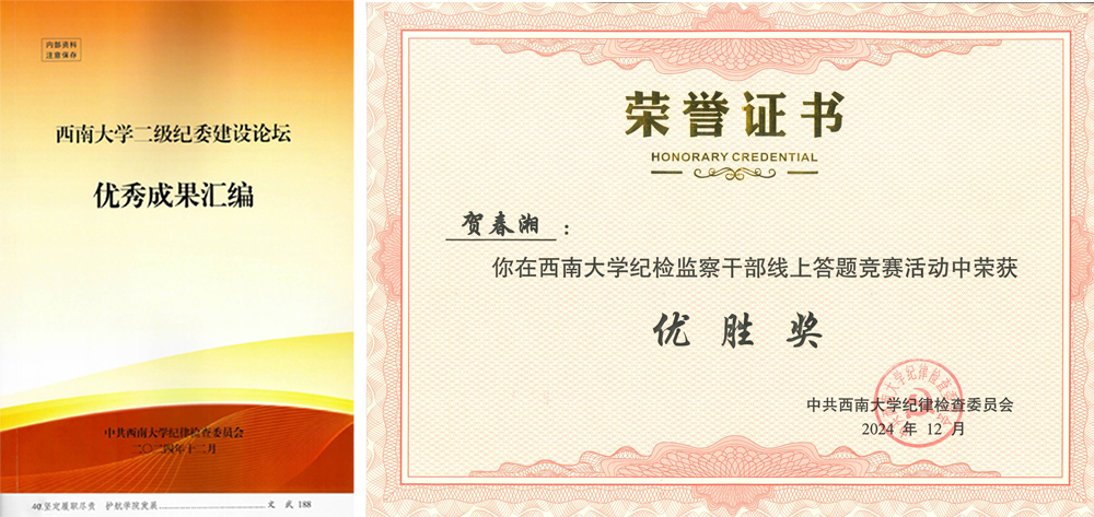 12月12日,学校纪委举行二级纪委建设论坛。论坛上,学院纪委工作得到了充分肯定,学院党委副书记、纪委书记文武结合学院纪委工作撰写的《坚定履职尽责 护航学院发展》入选学校二级纪委建设论坛优秀成果;学院纪委委员、组织员贺春湘荣获学校纪检监察干部线上答题竞赛优胜奖;本科生三支部选送的《守廉心,树新风》荣获廉洁教育系列活动“视廉清心”视频征集类二等奖;本科生三支部叶松的《清廉立身,共筑未来》、本科生二支部胡聪的《让廉洁之花在青春中绽放》荣获“话廉润心”校园征文类一等奖,研究生一支部张馨月的《以廉修身,树清风正气》、本科生二支部李宁波的《日常生活显廉洁》、周静萍的《扬廉洁之风,聚清风之气》荣获“话廉润心”校园征文类三等奖。