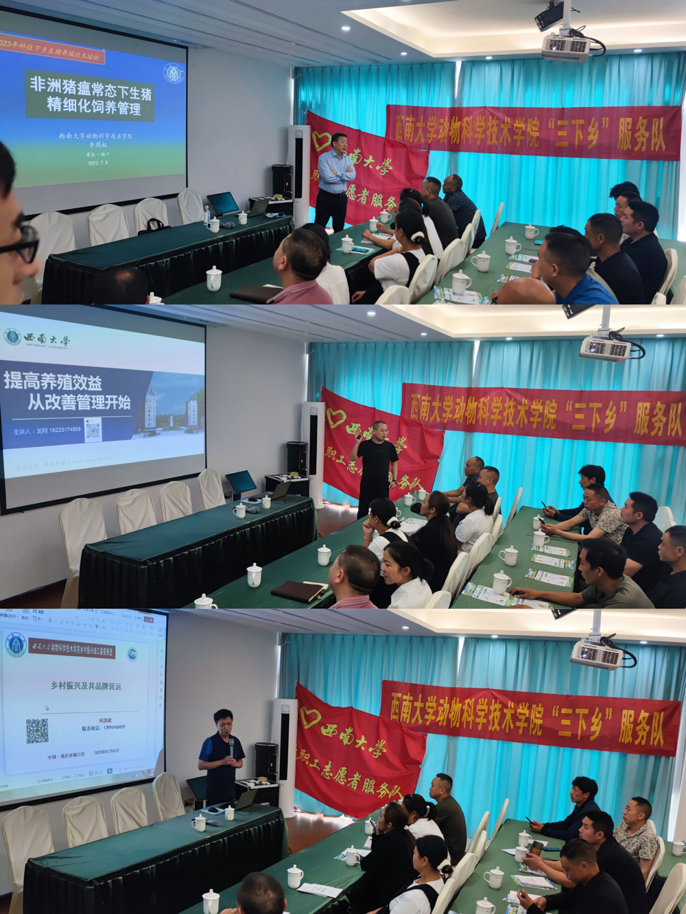 服务队首先来到城口县河鱼乡畜牧村,以专题授课的形式为广大养殖户做了“非洲猪瘟常态下生猪精细化饲养管理”“提高养殖效益从改善管理开始”“乡村振兴及其品牌营运”等培训,通过现场答疑解惑的方式对困扰当地养殖户的技术难题给出建议并进行实时解决,并现场与养殖户建立了线上联系机制,以便养殖户遇到困难时能够及时请教学院专家。同时为养殖户现场免费发放了200余份猪、肉牛、山羊和家禽养殖生产饲养管理技术资料和10000余元由重庆大农科技集团有限公司、重庆西农大科信动物药业有限公司、重庆市天龙牧业科技有限公司、成都牧科八维生物技术有限公司、重庆新动生物技术有限公司、重庆方迅科技有限公司和荆门龙谷饲料有限公司等企业赞助的乳猪用奶粉30份、畜用驱虫药1件(30袋)、兽药2件(80份)、牛羊舔砖3件(12*5 kg)、猪用预混料1件(20袋)、畜禽养殖场消毒剂50套、牛用饲料1吨,并为他们详细讲解了这些畜禽养殖用品及常用药品的使用方法。各养殖户纷纷表示通过此次活动,深深体会到上级部门对农村养殖业的关心和厚爱,也深刻感受到污漫