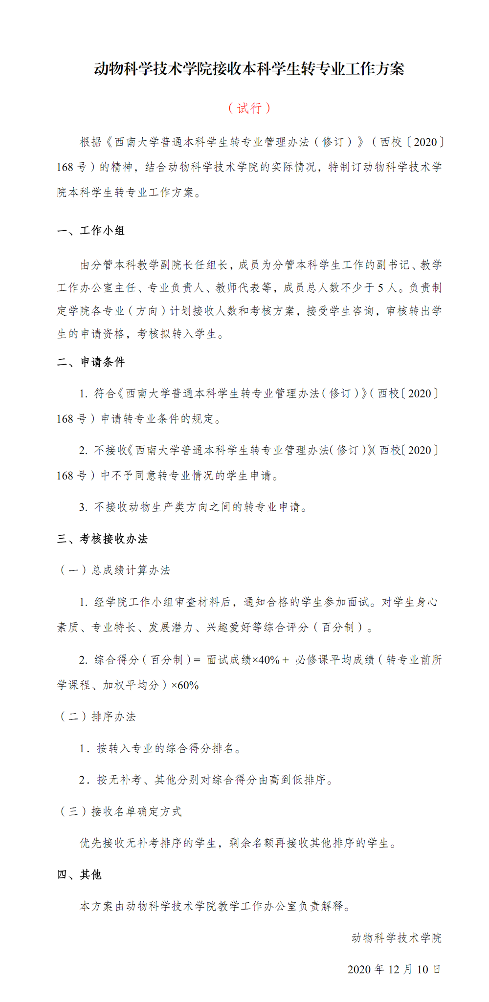 污漫 接收本科学生转专业工作方案(试行)