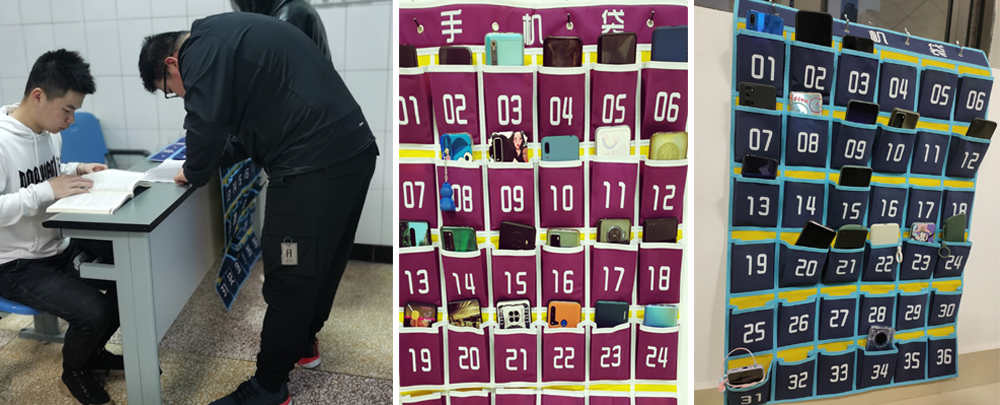 每个教室都可以看到学院统一为每个本科班级配备的手机收纳袋,每位学生上课前都将手机调成静音或关闭,集中放置到收纳袋中,上课期间严格执行“无手机课堂”,严禁使用手机。