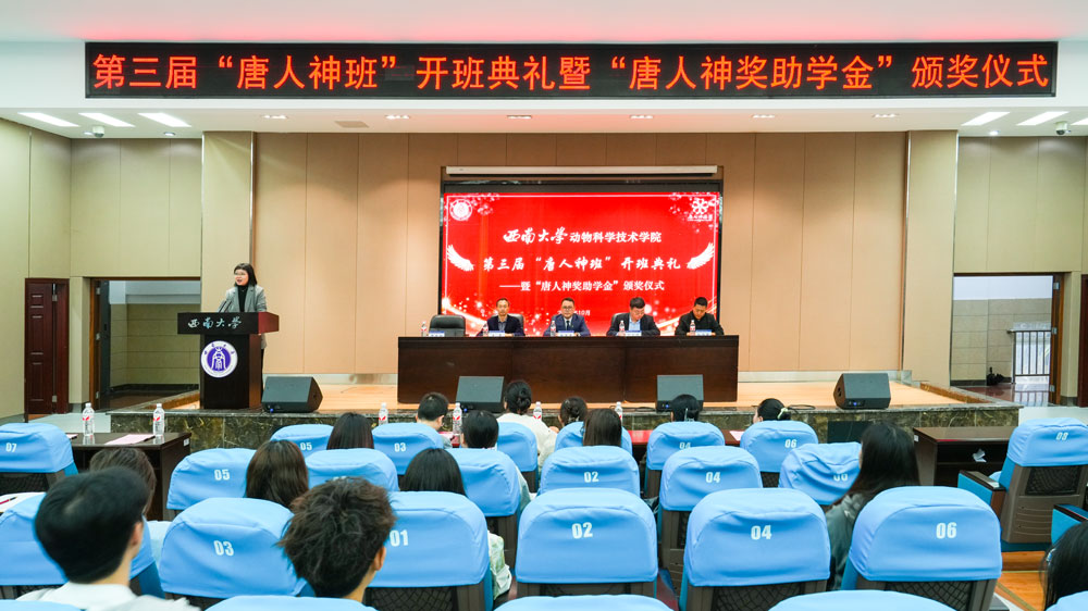 10月31日,学院在荣昌校区2211报告厅举行第三届“唐人神班”开班典礼暨“唐人神奖助学金”颁奖仪式,唐人神集团唐人神大学执行校长、人力资源中心培训部总经理赵海卫,人力资源中心招聘经理、第三届唐人神班企业班主任刘金伟,学院党委副书记、纪委书记文武,学院团委书记、学生工作办公室主任孙海军等出席。第三届唐人神班学员和学院各年级学生代表参加。仪式由学院组织员、第三届唐人神班校内班主任贺春湘主持。