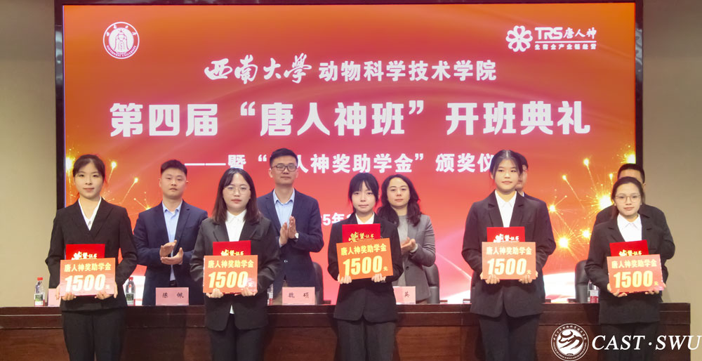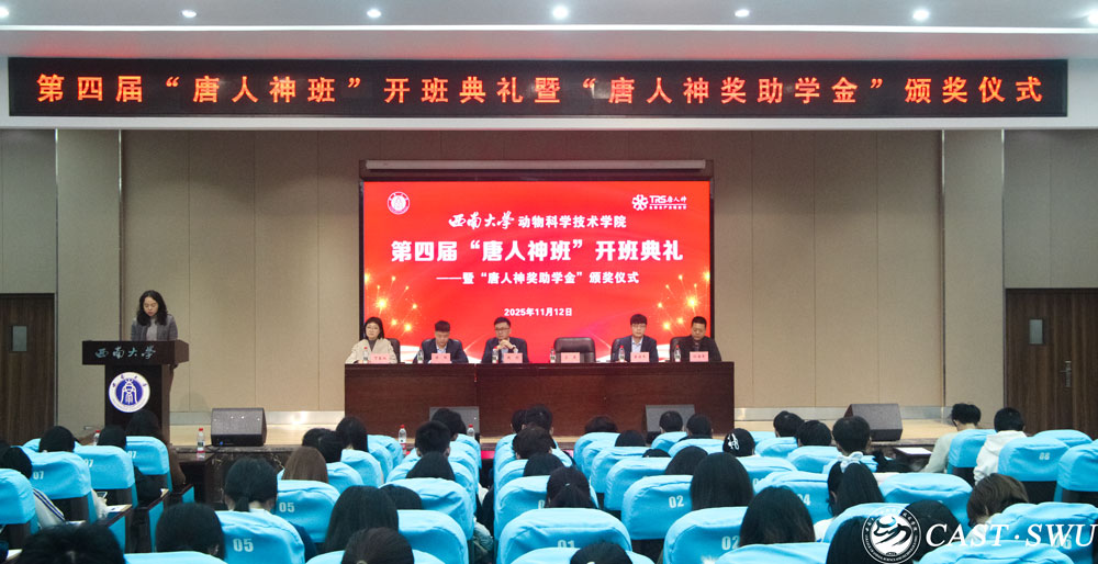 11月12日,学院在荣昌校区2211报告厅举行第四届“唐人神班”开班典礼暨“唐人神奖助学金”颁奖仪式,唐人神集团饲料事业部人力资源总监魏硕,人力资源中心校招负责人、第四届唐人神班企业班主任陈佩,人力资源中心招聘经理易佳冬,学院党委副书记兰英,学院团委书记、学生工作办公室主任孙海军等出席典礼。学院办公室工作人员、第四届唐人神班学员和学院各年级学生代表到场参加。典礼由学院组织员、第四届唐人神班校内班主任贺春湘主持。