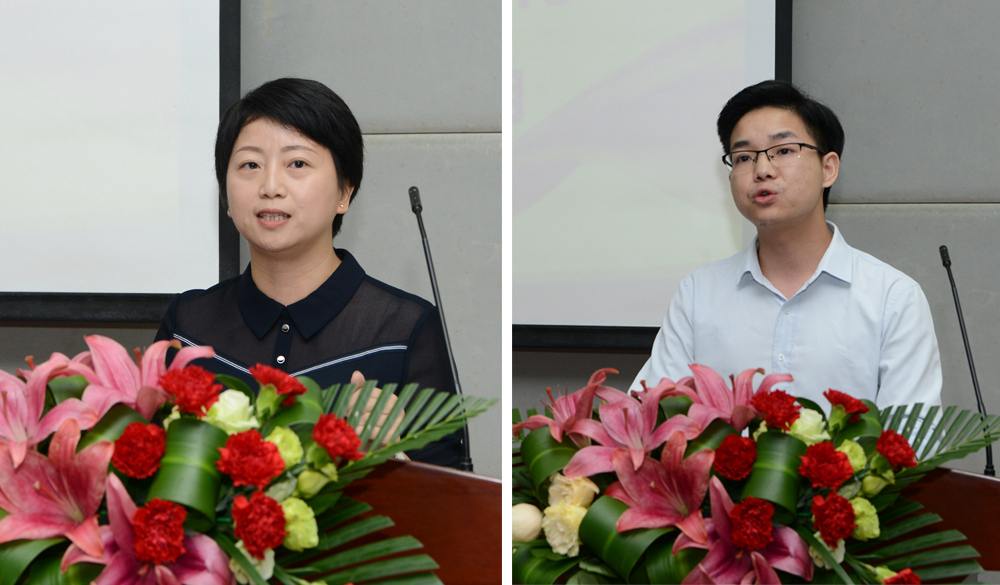 老生代表和新生代表在学院(北碚)新生开学典礼发言