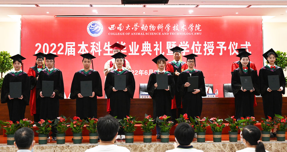 厚植三农情怀启新程,助力乡村振兴展宏图。6月23日下午,学院在荣昌校区7B101报告厅隆重举行2022届本科生毕业典礼暨学位授予仪式。学校党委常委、副校长王进军,学院党委书记赵智华,院长、党委副书记、学术委员会主任赵永聚,副院长周克勇、赵中权,优秀校友代表、重庆市畜牧科学院党委委员、生物工程研究所所长葛良鹏研究员,学院学术委员会副主任刘安芳等出席典礼,系主任、教师代表、辅导员、毕业班班主任、2022届本科毕业生代表参加仪式。仪式由党委副书记、纪委书记文武主持。