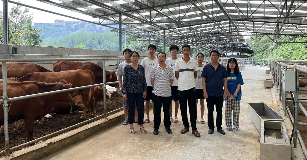 培训期间,学院肉牛科技团队成员赴丰都县肉牛良种繁育中心现场指导“红西本”牛群的选育工作,对牛场的生物安全防控要点、牛群的选配及饲养管理制度等方面提出指导意见,并为在该牛场实习的本科生开展实习指导。