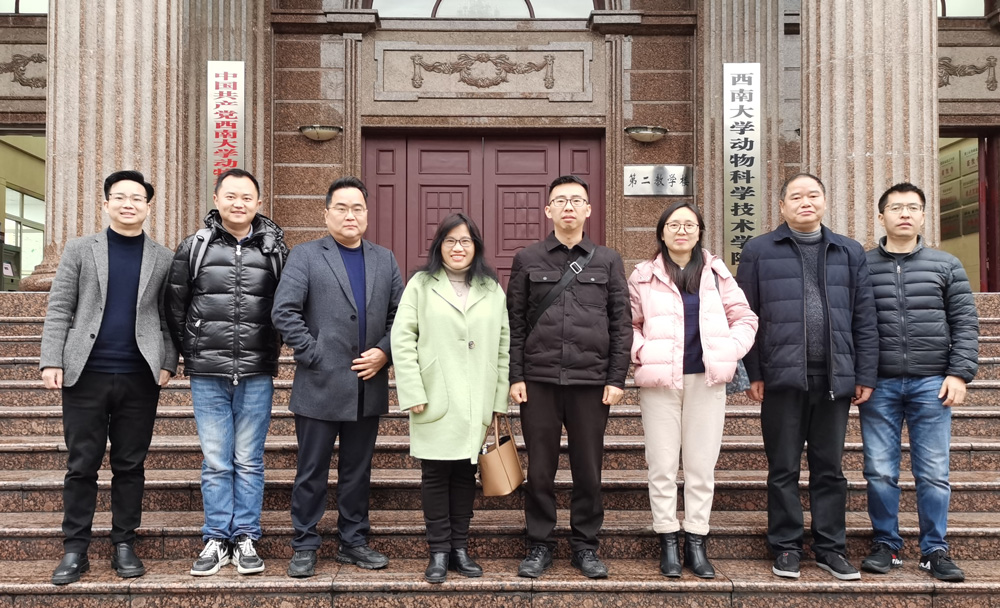 杨朝武一行参观了学院科研实验室、实验农场、大学生创新创业基地后,就区域创新合作项目启动、川渝家禽科创平台共建、院校专业人才培养互动、川渝家禽区域性育种联合体建设等事宜与学院进行了详细交流。双方聚焦川渝地区家禽产业发展共性问题,就两院紧密协作和资源共享、共建川渝优质鸡育种与生产协作中心等科研平台达成一致意见,并在开展川渝地方鸡种资源研究、新品种培育方面制定了详细的实施方案。重庆市荣昌区农业农村委正高级兽医师范才良参加了座谈。