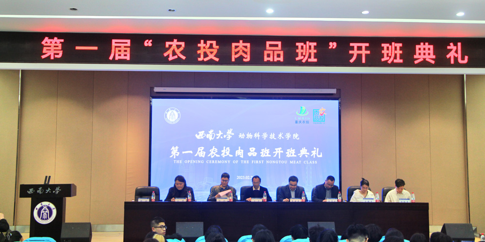 为深入学习贯彻党的二十大精神,系统推进“六有”新动科人才培养,2月28日下午,学院在荣昌校区2211报告厅举行第一届“农投肉品班”开班典礼暨校园招聘宣讲。重庆农投肉食品有限公司党委副书记熊世鸿、副总经理陈华云、科创中心主任余群莲、组织人事部部长王倩、人力资源部招聘专员樊勤英,学院党委副书记、纪委书记文武、副院长向钊、第一届农投肉品班学员和各年级学生代表等参加,典礼由“农投肉品班”校内班主任郑优主持。
