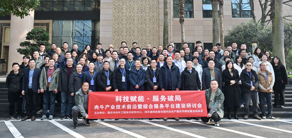 荣昌校区顺利召开。会议由重庆市肉牛工程技术研究中心(以下简称中心)、肉牛遗传改良与现代化生产重庆市高校重点实验室(以下简称重点实验室)联合主办,重庆犇腾畜牧科技有限公司、丰都肉牛产业研究院等单位承办。会议以“科技赋能服务,协同破局内卷——创新肉牛综合服务新模式”为主题,旨在探讨肉牛产业技术创新与综合服务模式的发展路径。学院党委书记赵智华、院长赵永聚出席会议,来自云南、四川、贵州、重庆、内蒙等地的专家学者和企业代表80余人参加了本次会议。会议开幕式由学院副院长向钊主持。