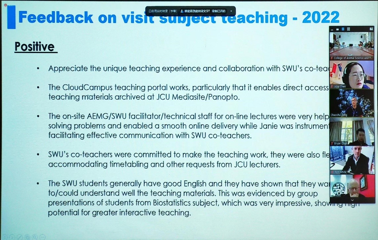 6月18日,学院与澳大利亚詹姆斯·库克大学(James Cook University,JCU)及澳大利亚教育管理集团(AEMG)顺利召开2021 – 2022学期动物科学中外合作办学学术指导委员会(Academic Advisory Board,简称AAB)视频会议。JCU理学与工程学院院长Ron White教授,公共卫生与兽医学院院长Ted Whittem教授,国际处处长Clare Magee女士,国际关系处主任Janie Edwards女士等专家教授出席会议;污漫 副院长赵中权,学院中外合作办公室副主任杨游副教授、秘书孙雅望博士,共课教师代表唐自如教授、韩玉竹副教授等教师,以及AEMG的Bruce Calway教授等相关工作人员共同参加。