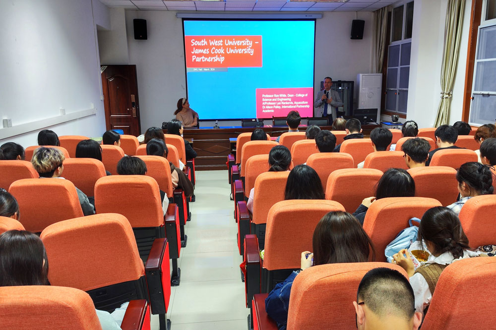 随后,Ronald White教授为2022级、2023级动物科学专业中外合作办学项目的学生进行宣讲。宣讲会上,他为学生详细介绍了JCU的教育理念、学术资源以及留学生活的各个方面。强调了选择JCU的多重优势,包括其在动物科学领域的专业排名、国家级研究中心和项目,以及学校对国际伙伴关系的重视。他还特别提到“2+2”和“3+2”留学项目的结构和优势,以及通过这些项目在未来职业发展上的潜力。JCU国际项目协调员Allison Paley博士通过精彩的《A Journey to Academic Life》幻灯片展示,向学生阐述了她自己从学生到科学家的成长故事、从美国到澳大利亚留学并定居的心路历程。她还分享了学习科研、博士后研究项目,以及微塑料对珊瑚的影响等研究话题。