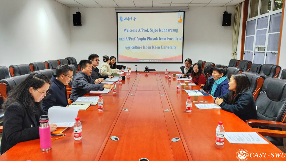 为期四个月的学习、科研及生活体验,特别提到中文能力的显著提升,并对中国文化、城市风貌、美食、校园环境表示高度赞赏。学院人才培养办公室主任李洋、动物营养与饲料科学系老师徐叶桐回顾了寒假赴孔敬大学交流的收获,分享了泰方在农业教育与科研领域的创新实践。在科研合作研讨环节,学院陈小川副教授以“重庆热应激对山羊内分泌代谢及肉品质的影响”为主题介绍其科研成果,并与泰国专家探讨热应激对家畜、家禽的影响及防治措施,双方就共同关注的领域达成进一步合作的意向。会议还就今年5月孔敬大学师生回访的日程安排及规模进行磋商,为后续常态化合作奠定基础。