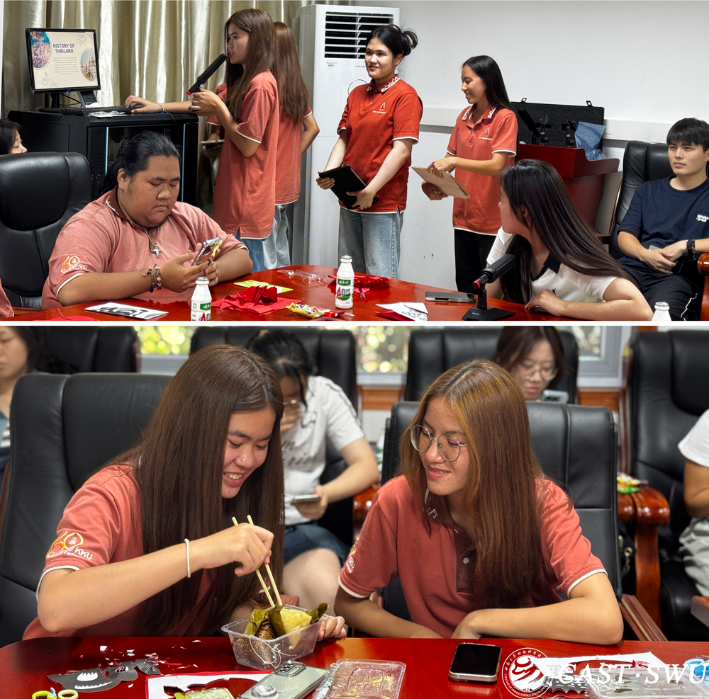 活动尾声,中泰学子共同品尝了香甜的粽子,在轻松愉快的氛围中交流两国文化习俗与求学经历。最后,大家一起合影留念,为这场跨越国界的文化对话划上圆满句号。本次交流活动不仅增进了中泰青年之间的相互了解,更以文化为纽带,搭建起友谊的桥梁,增进了中泰青年之间的相互了解,未来污漫